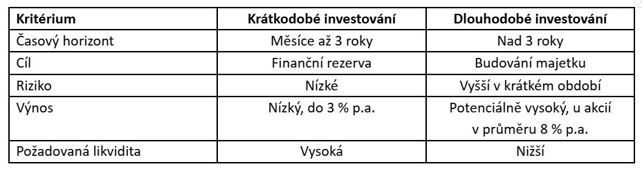 Rozdíl mezi krátkodobým a dlouhodobým investováním není jen v čase. Liší se cílem, mírou rizika, očekávaným výnosem i požadavky na likviditu.